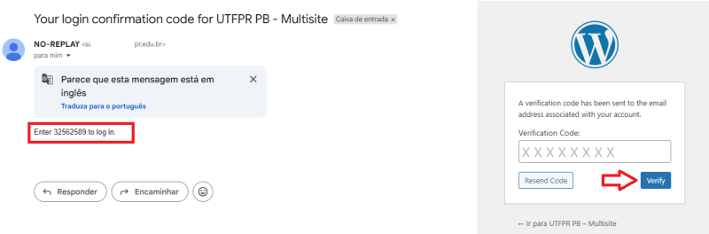 4. Será encaminhado para o e-mail um código de segundo fator de autenticação. Digite este código no campo Verification Code e clique no botão Verify:
