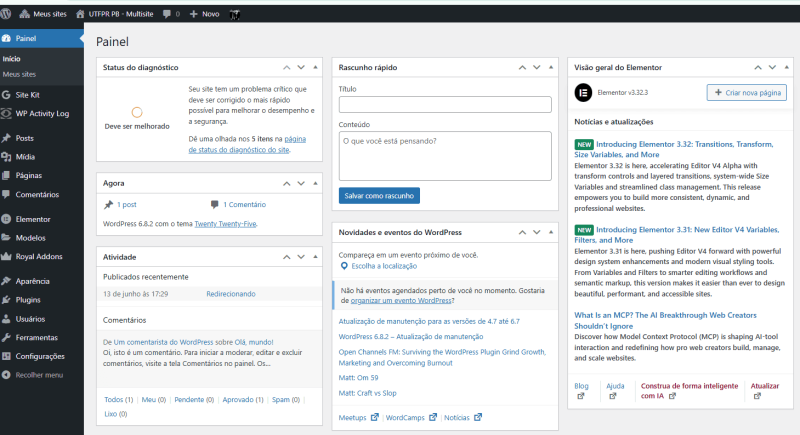 5. Com isso, será acessado o Painel de Administração do site no WordPress, possibilitando dar início às personalizações e publicações necessárias: