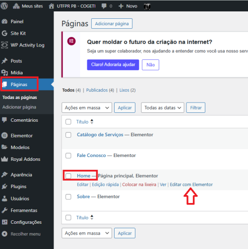 Para isso, acesse a opção Páginas no Dashboard do WordPress, e clique na opção Editar com Elementor para abrir a página para edição.